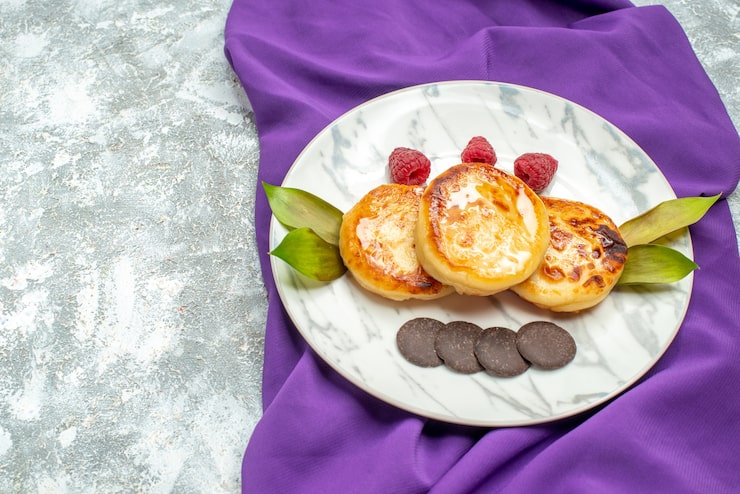 - Сырники, обжаренные на сковороде и немного остывшие, с пышной текстурой, как будто испеченные в детском саду, подаются к трапезе с вареньем.